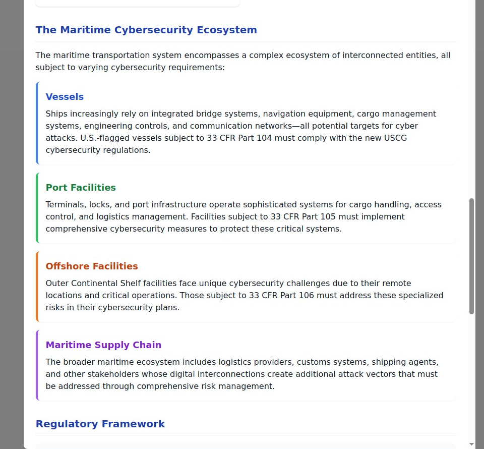 The U.S. Coast Guard’s new cybersecurity regulations under 33 CFR Parts 104, 105, and 106 represent the most comprehensive maritime cybersecurity requirements ever implemented. These regulations mandate that covered entities develop, implement, and maintain cybersecurity programs tailored to their specific operational environments.