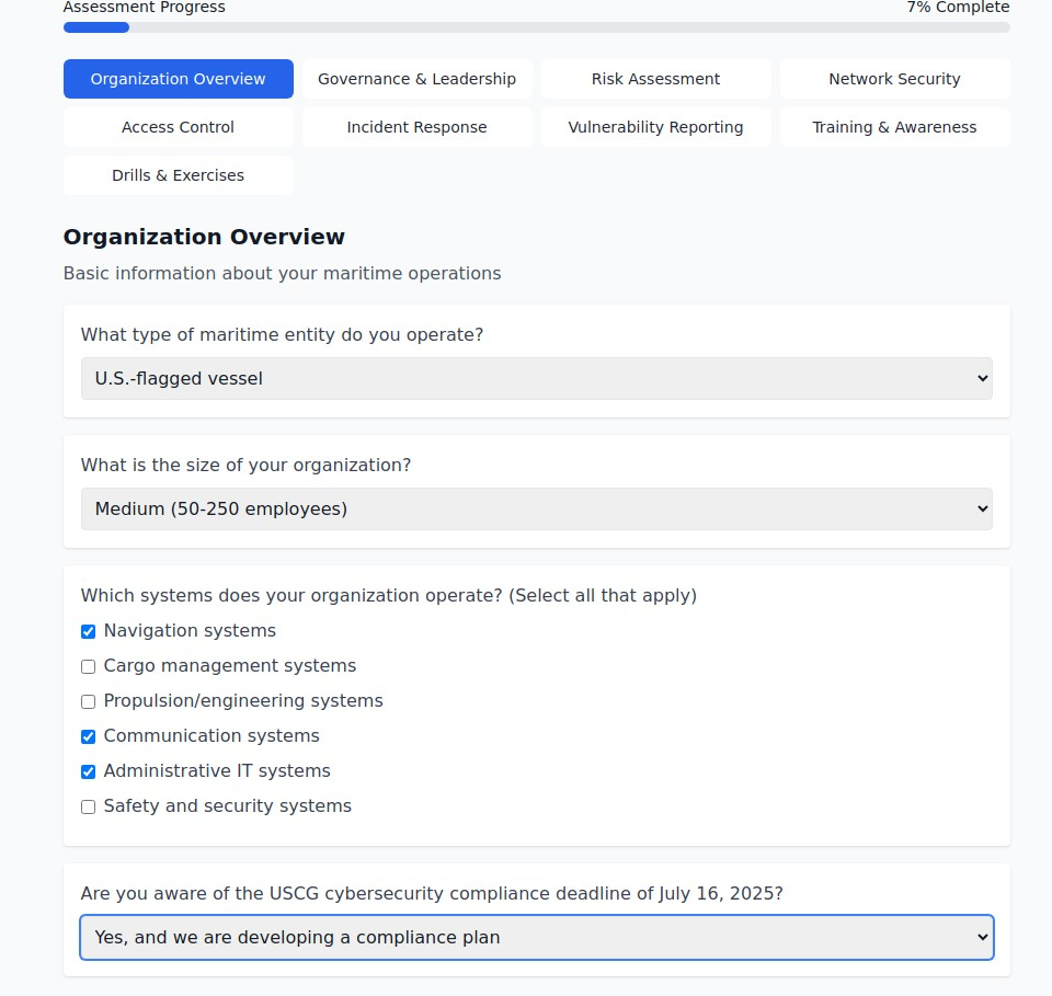Free self-assessment tool for maritime organizations to evaluate cybersecurity readiness and USCG compliance. Comprehensive evaluation across 8 key domains. Effective for July 16, 2025 requirements.