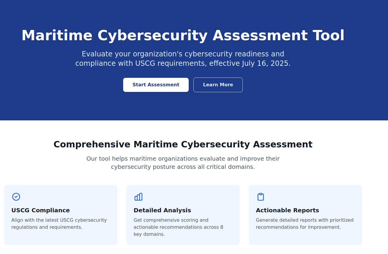 Free self-assessment tool for maritime organizations to evaluate cybersecurity readiness and USCG compliance. Comprehensive evaluation across 8 key domains. Effective for July 16, 2025 requirements.