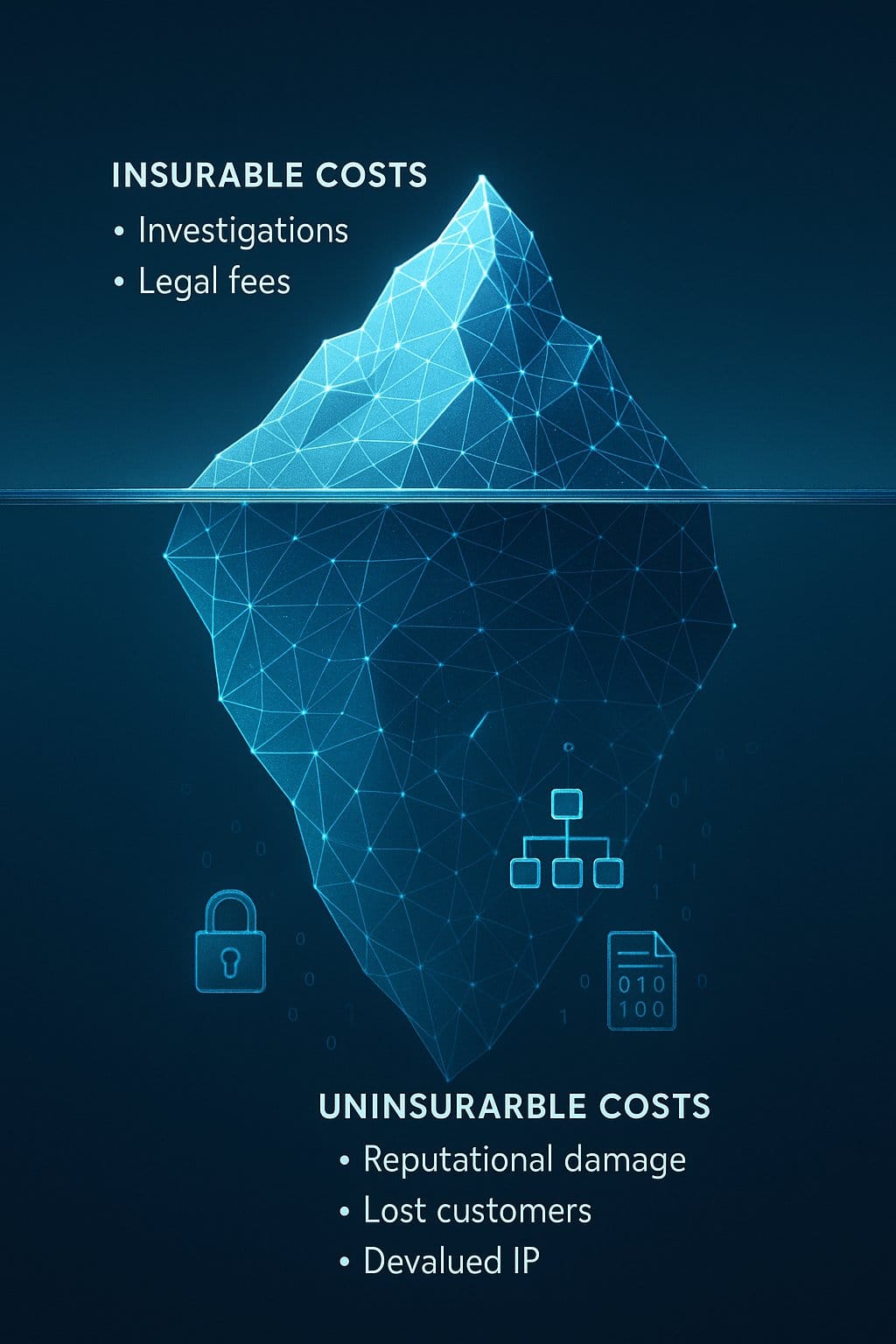 While data breaches and immediate financial costs like investigations or legal fees capture headlines, these often represent only a small portion of the true impact of a cyber incident. The sources describe this as the “iceberg impact” of a cyber loss. Much larger, more complex, and often uninsurable costs are hidden below the surface.