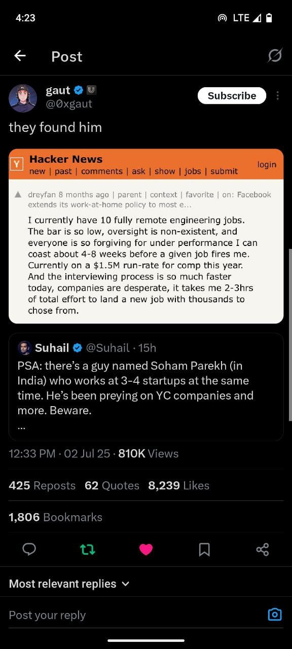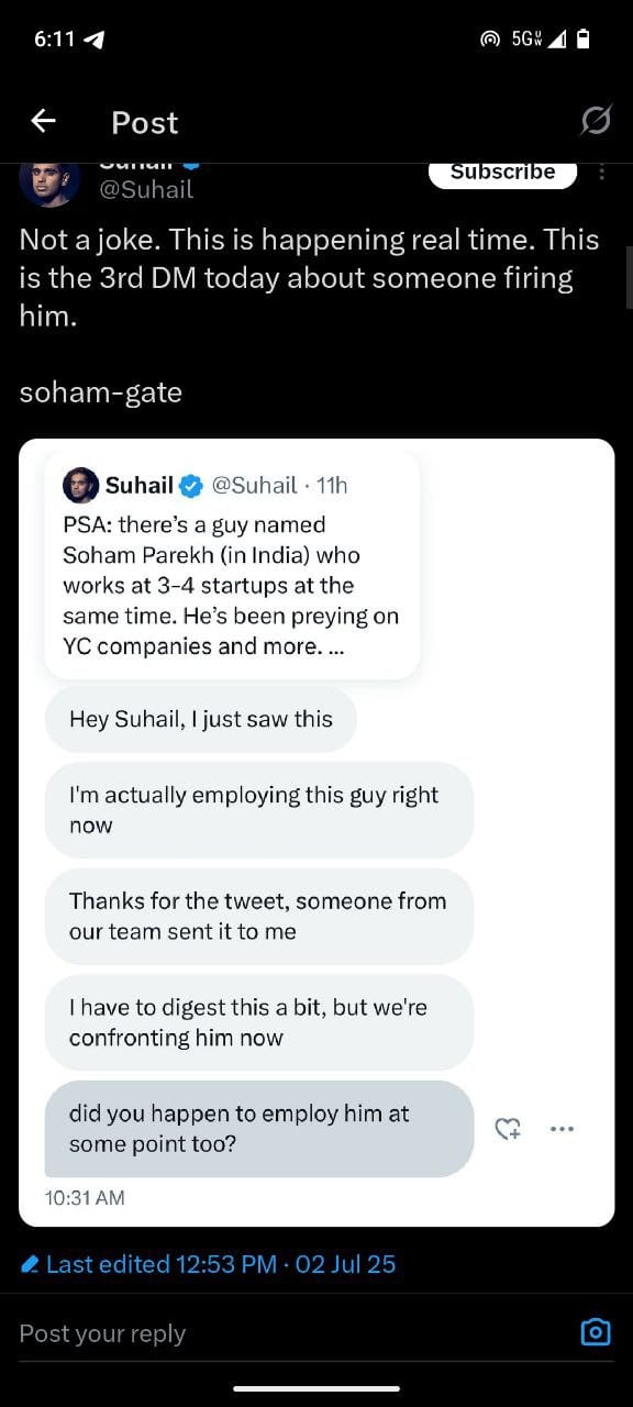 PSA: thereâs a guy named Soham Parekh (in India) who works at 3-4 startups at the same time. Heâs been preying on YC companies and more. Beware.