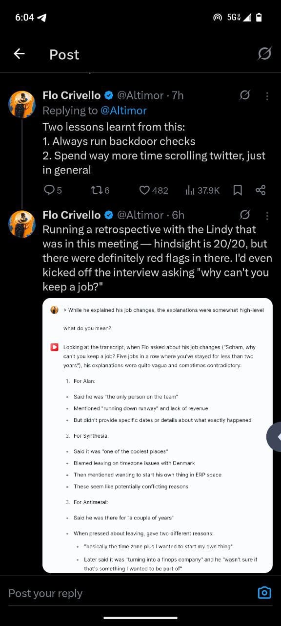 Holy shit. We hired this guy a week ago. Fired this morning. He did so incredibly well in interviews, must have a lot of training. Careful out there. https://t.co/XP33febCYs â Flo Crivello (@Altimor) July 2, 2025